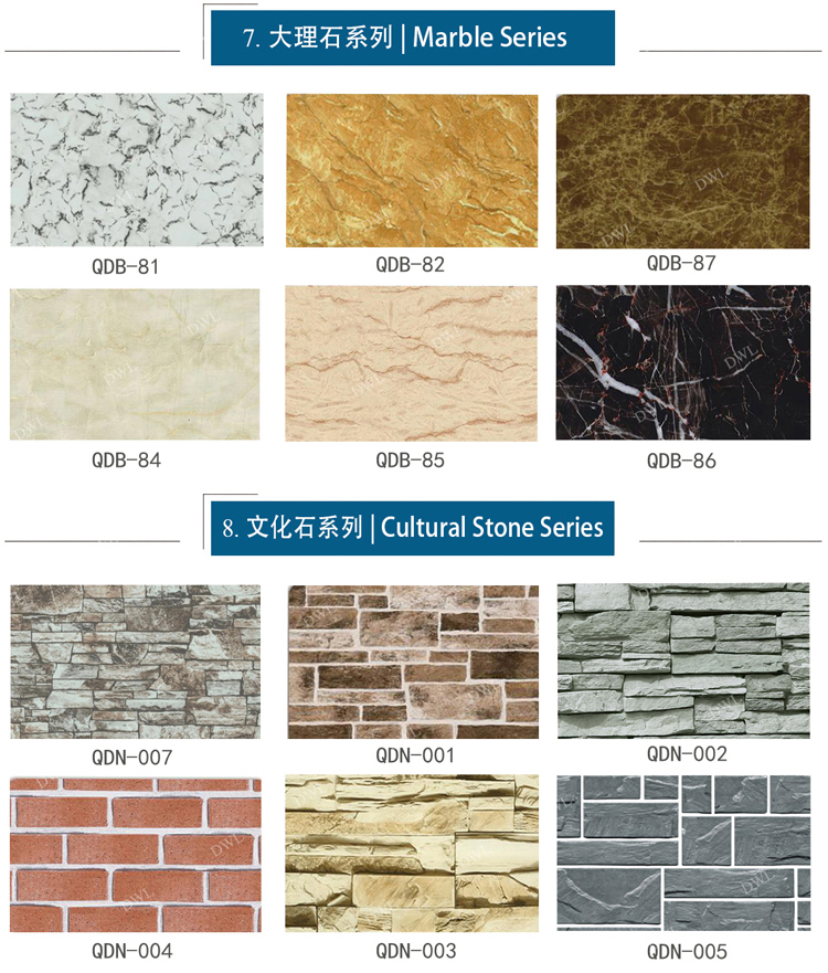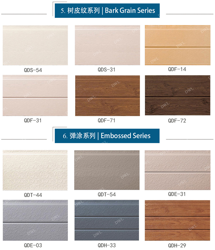 DWL panel, the international light-weight walling material, integrates decoration, insulation, energy-efficiency, fire-proof together. Its metal surface can be designed and embossed into all kinds of styles: brick, marble, wood, monochrame etc. and there are more than 100 kinds of color for you to choose from. The core layer is polyrethane foam which is independent airtight foaming structure. It can effectively insulate the heat and sound (Thermal conductivity:0.024W/M.K). The fire-resistant grade has reached to the B1. The back material is Aluminum foil layer, which can reflect the heat back. The three layers of material is formed together by auto machine, and the structure is stable. The installation of DWL panel is very simple and convenient, and the installation cannot be influenced by weather and climate.
